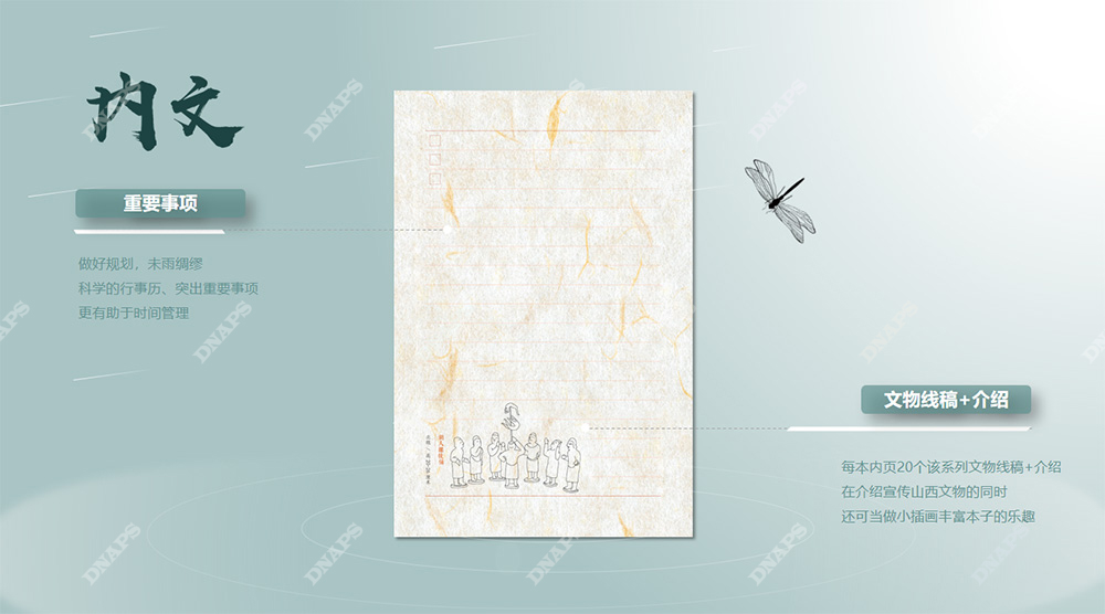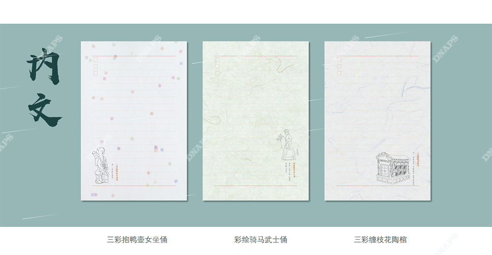 晉寶藏文物插畫(huà)筆記本封面選取在山西博物院中以玉器、琉璃、青銅器、陶器、瓷器為代表的五件器物來(lái)進(jìn)行手繪,內(nèi)文同樣是手繪的各種類(lèi)文物,整套筆記本圍繞古代東方藝術(shù)博物館主題展現(xiàn),加以精致的燙金及UV工藝,做工精美,意義重大。